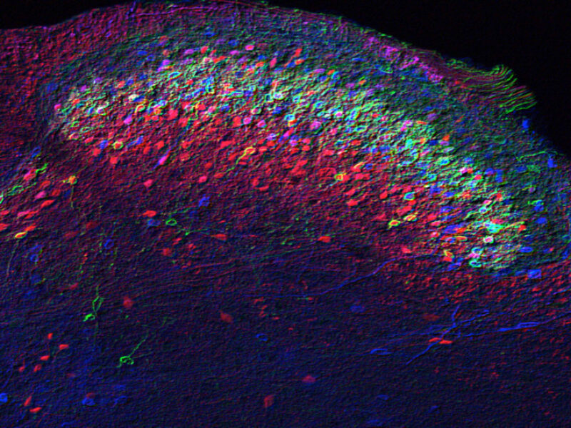 Rita Allen Foundation Scholar Rebecca Seal studies key neuronal elements that make up the spinal cord circuit for mechanical pain. Neurons expressing the proteins VGLUT3 (red), PKC gamma (green) and calretinin (blue) are organized in consecutive layers and play a critical role in mechanical hypersensitivity induced by nerve injury or inflammation. (Image: Cedric Peirs)